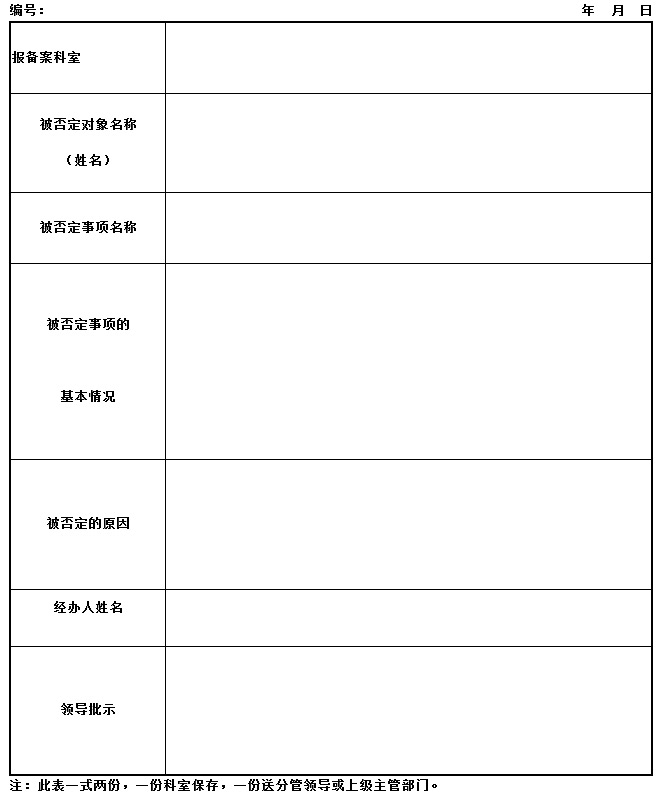 2、对经核实符合否定条件的事项,由经办人员填写一式两份《否定报备登记表》(见附表),经科室负责人审核后,报分管领导批准,一份送分管领导或上级主管机关,另一份由经办人或单位将其与审办材料一并存档备案。