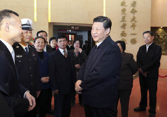 3月17日至18日,中共中央总书记、国家主席、中央军委主席习近平在河南省兰考县调研指导党的群众路线教育实践活动。这是3月17日,习近平在参观焦裕禄同志纪念馆时同焦裕禄亲属和基层模范干部代表亲切交流。新华社记者丁林摄